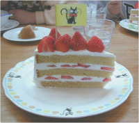 | ふぞろいいちごのショートケーキ(旗とお皿はジジ柄)750円 大きいよ〜!これは午後1時半からじゃないと食べられない。 |