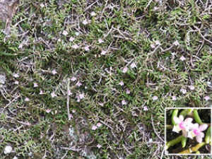 ムカデ蘭は蘭科の植物で、葉と枝は硬く、細長い根をあちこちから出し、水分が少なくても枯れることがありません。形状がムカデに似ていることから、ムカデ蘭と呼ばれています。春に白い新しい根をはり、7月下旬に米粒程のピンクの、小さい可愛い花をつけます。