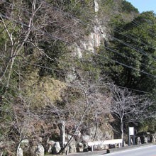 ここから見上げると、国道に迫出す様にそそり立つのが「観音岩」 別名「ほうろく岩」と言われています。ほうろく岩の下の池の中には「天然記念物むかでらん群落 内務省」の碑が建てられています。